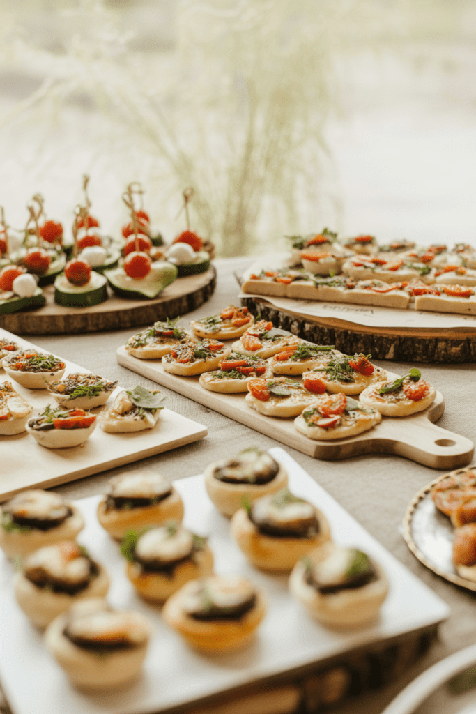 This isn’t just a snack spread — it’s the DIY party bites everyone hovers around all night. Fresh mini flatbreads layered with creamy spreads. Bright spring skewers stacked with tomatoes and mozzarella. Golden garlic butter mushrooms straight from the oven. Bite-sized flavors that look beautiful on the table and disappear almost as quickly as you serve them.