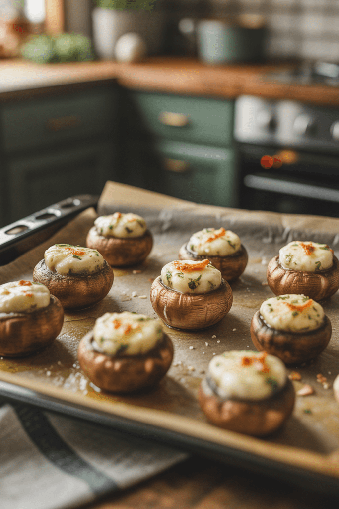 Remove the stems from mini mushrooms and fill the center with garlic butter and a sprinkle of Parmesan. Bake at 375°F (190°C) for about 12–15 minutes until tender and golden.