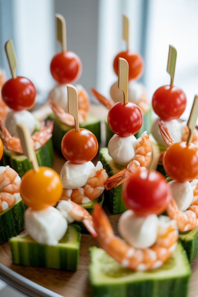 Thread cherry tomatoes, mozzarella balls, cucumber slices, and shrimp onto small skewers. Finish with a drizzle of pesto or balsamic glaze for extra flavor.