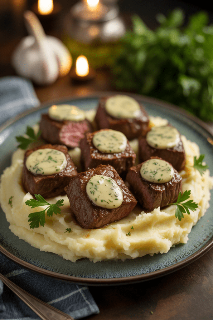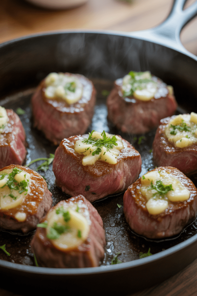 Spoon the melted garlic butter over the steak bites for 1–2 minutes until fragrant. - Finish & Serve