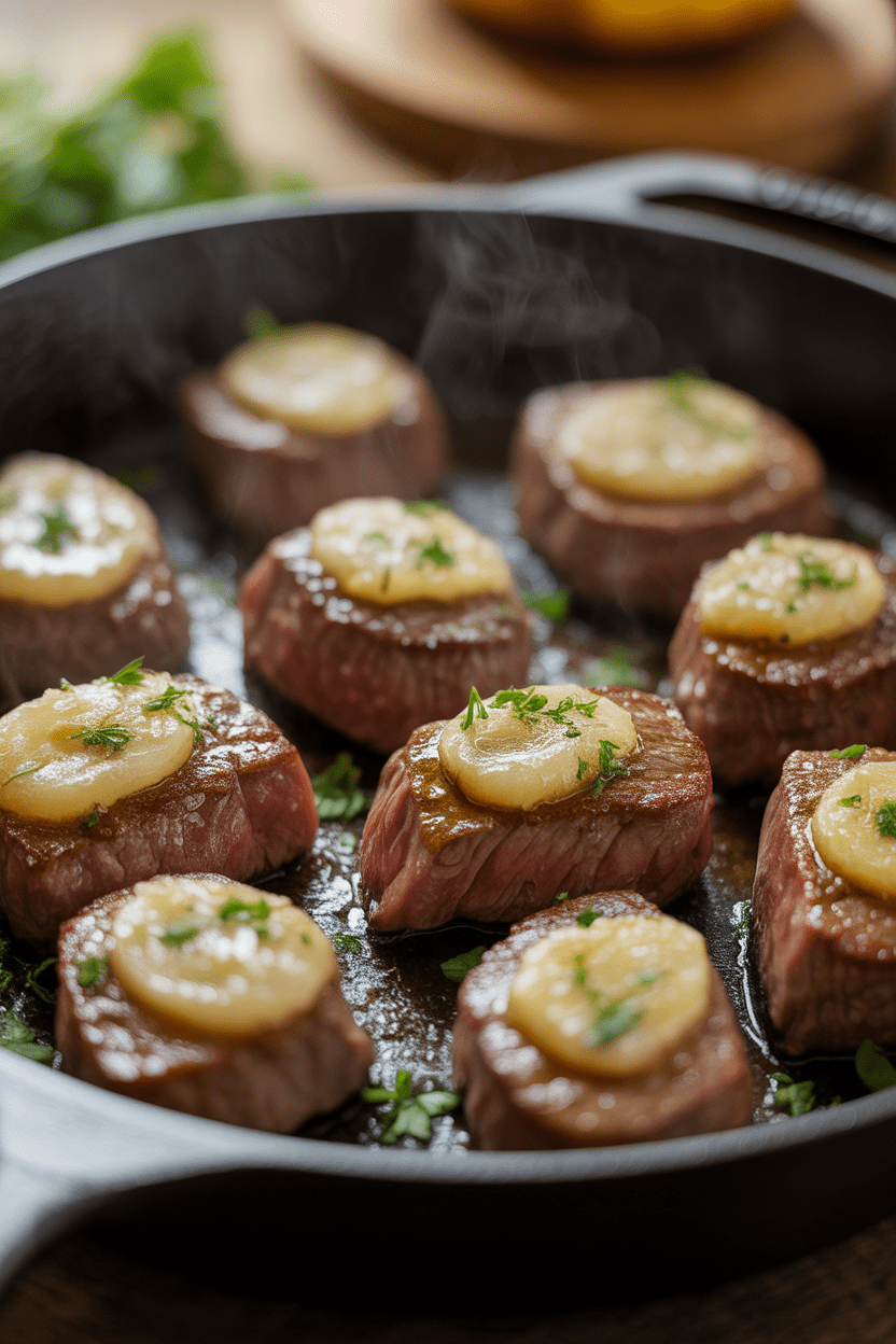 Spoon the melted garlic butter over the steak bites for 1–2 minutes until fragrant. - Finish & Serve